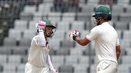 মঙ্গলবার তৃতীয় দিনে ৮৮ ওভার খেলে ৩ উইকেট হারিয়ে ২৪২ রান করে বাংলাদেশ। বুধবার আগের দিনের করা ৩১৮/৩ রান নিয়ে ফের ব্যাটিংয়ে নামে টাইগাররা। আগের দিনে ৫৪ রানে অপরাজিত থাকা লিটন দাস এদিন লাঞ্চের ঠিক আগে আউট হন। তার আগে ১৮৯ বল খেলে ১০টি বাউন্ডারির সাহায্যে ৮৮ রান করেন। পঞ্চম উইকেটে মুশফিকের সঙ্গে লিটন গড়েন ১৬৪ রানের জুটি। লিটন আউট হওয়ার পর ফের মাঠে নামেন তামিম ইকবাল। আগের দিনে ১৩৩ রানে রিটায়ার্ড হার্ট হয়ে ফেরা তামিম এদিন ব্যাটিংয়ে নেমেই কোনো রান যোগ করার আগেই আউট হন।