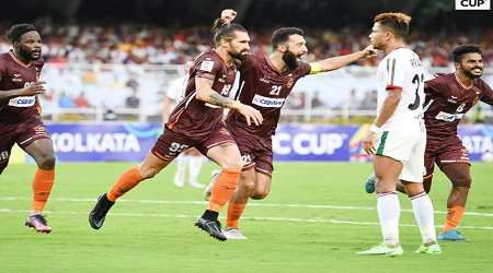 স্পোর্টস ডেসক্ : দারুণ জয়ে এএফসি কাপ মিশন শুরু করলো গোকুলাম কেরালা। আজ যুব ভারতীয় ক্রীড়াঙ্গনে ডি গ্রুপের প্রথম ম্যাচে এটিকে মোহনবাগানের বিপক্ষে ৪-২ গোলের জয় পেয়েছে তাঁরা। জোড়া গোল করেছেন লুকা মাচিন। একটি করে গোল করেছেন রাশিদ ও জিতিন। মোহনবাগানের দুই গোল করেন প্রীতম কোটাল ও লিস্তন কোলাসো। প্রথমার্ধে বেশ কয়েকটি সুযোগ নষ্ট করে মোহনবাগান ফরোয়ার্ডরা। ১৮ মিনিটে রয় কৃষ্ণার নিচু শট দুরের পোস্টের ভেতরের দিকে লেগেও বল জালে জড়ায়নি। এগিয়ে যাওয়া হয়নি এটিকের। ২৮ মিনিটে সুযোগ নষ্ট করেন জনি কাউকো। বক্সের মুখ থেকে তার নেওয়া শট সরাসরি চলে যায় গোকুলামের গোলকিপারের হাতে। পোস্টের দুই পাশের যেকোনো একদিকে শট নিলেই পেতে পারতেন গোলের দেখা। ৩৯ মিনিটে চোট পেয়ে মাঠ ছাড়েন স্প্যানিশ ডিফেন্ডার তিরি। তার বদলে নামেন ভারতীয় ডিফেন্ডার আশুতোষ।