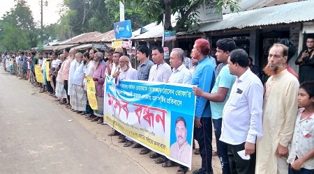 মোঃ মাজহারুল ইসলাম ,লালপুর (নাটোর) প্রতিনিধি : সন্ত্রাসী কায়দায় সাধারন মানুষকে মারধর করে এলাকায় ত্রাস সৃষ্টি, শালিশী বৈঠকে একতরফা ফায়সালা প্রদান ও জনসাধারণের সাথে অসামাজিক আচরণের প্রতিবাদে নাটোরের লালপুর উপজেলার দুড়দুড়িয়া ইউনিয়ন পরিষদের চেয়ারম্যান তোফাজ্জল হোসেন তোফার বিরুদ্ধে মানববন্ধন করেছে স্থানীয় জনসাধারন।বুধবার (৮ জুন) বিকেল সাড়ে পাঁচটার দিকে উপজেলার লালপুর – বাঘা সড়কের বেরিলাবাড়ী (জামতলা) মোড়ে এ মানববন্ধন করা হয়।