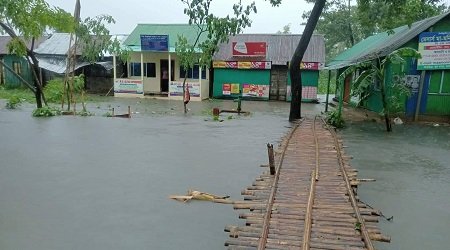 বাদল আহাম্মদ খান ,ব্রাহ্মণবাড়িয়া জেলা প্রতিনিধি : টানাবর্ষণ ও ভারতীয় পাহাড়ি পানির তোড়ে ব্রাহ্মণবাড়িয়ার আখাউড়া স্থলবন্দর এলাকা তলিয়ে গেছে। এতে যাত্রী পারাপারে দুর্ভোগ নেমে আসে। আখাউড়া ইমিগ্রেশন পুলিশের সহকারি পরিদর্শক মো. জাফর জানান, শুক্রবার দুপুর থেকে টানা বৃষ্টি ও ভারতের ত্রিপুরা রাজ্য থেকে ঢলের পানি নেমে আসায় ইমিগ্রেশনেরর সামনেন সড়ক প্রায় দুই ফুট পানির নিচে তলিয়ে গেছে। ইমিগ্রেশন ভবনেও পানি ছুঁই ছুই করছে। একপ্রকার পানিবন্দি অবস্থায় তাদেরকে কাজ সারতে হচ্ছে। বিকেল থেকে বন্দরের পাশ হয়ে যাওয়া খাল দিয়েও দ্রুত বেগে পানি আসছে।