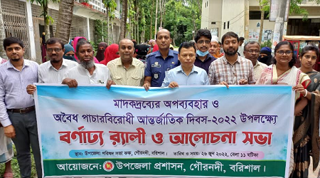 বিশ্বজিত সরকার বিপ্লব গৌরনদী (বরিশাল) প্রতিনিধি : বরিশালের গৌরনদী উপজেলায় উপজেলা প্রশাসনের আয়োজনে মাদকদ্রব্যের অপব্যবহার ও অবৈধ পাচারবিরোধী আন্তর্জাতিক দিবস-২০২২ উপলক্ষে বর্নাঢ্য র্যালী ও আলোচনা সভা অনুষ্ঠিত হয়েছে। গৌরনদী উপজেলা প্রশাসনের আয়োজনে রোববার সকালে উপজেলা চত্বর থেকে বর্নাঢ্য র্যালী বের হয়ে বিভিন্ন সড়ক প্রদক্ষিণ করে উপজেলা পরিষদ চত্বরে শেষ হয়।