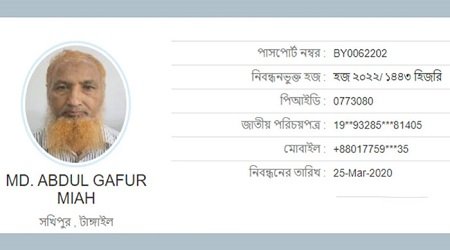 ডেস্ক নিউজ : সৌদি আরবে আরও এক বাংলাদেশি হজযাত্রীর মৃত্যু হয়েছে। তার নাম মো. আব্দুল গফুর মিয়া (৬১)। তিনি টাঙ্গাইলের বাসিন্দা। পাসপোর্ট নম্বর- BY0062202।