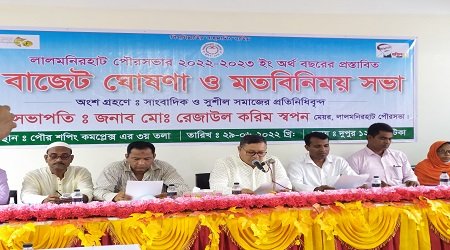 জিন্নাতুল ইসলাম জিন্না,লালমনিরহাট প্রতিনিধি : লালমনিরহাট পৌরসভার ২০২২-২৩ অর্থ বছরে ৫৩ কোটি ৭৮ লক্ষ ৯৮ হাজার ৫৬১ টাকার বাজেট ঘোষণা করা হয়েছে। বুধবার (২৯ জুন) দুপুরে পৌর শপিং কমপ্লেক্সে মেয়র রেজাউল করিম স্বপন এ বাজেট ঘোষণা করেন।বাজেটে পৌর রাজস্ব আয় ১১ কোটি ৬০ লক্ষ ৬৯ হাজার, পানি সরবরাহ খাতে ৫৪ লক্ষ ৫০ হাজার এবং সরকারী ও বেসরকারি উন্নয়ন হিসাব খাতে প্রকল্পসহ ৪১ কোটি ৬৩ লক্ষ ৭৯ হাজার টাকা আয়ের লক্ষমাত্রা নির্ধারণ করা হয়েছে। এতে প্রস্তাবিত বাজেট ধরা হয়েছে রাজস্ব খাতে ১০ কোটি ৯২ লক্ষ, পানি সরবরাহ খাতে ৫৩ লক্ষ ২৫ হাজার ও উন্নয়ন খাতে ৪১ কোটি ৬৩ লক্ষ ৭৯ হাজার টাকা।