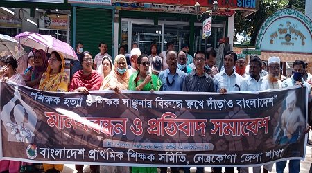 ইকবাল হাসান ,নেত্রকোণা প্রতিনিধি : ” শিক্ষক হত্যা ও শিক্ষক লাঞ্ছনার বিরুদ্ধে রুখে দাড়াও বাংলাদেশ ” এই স্লোগানকে ধারণ করে নেত্রকোণায় শিক্ষকবন্ধন ও প্রতিবাদ সমাবেশ অনুষ্ঠিত হয়েছে। আজ সকাল ১১ টায় নেত্রকোণা কেন্দ্রীয় শহীদ মিনারের সামনে ঘন্টাব্যাপী প্রাথমিক ও মাধ্যমিক বিদ্যালয়ের শিক্ষকদের যৌথ উদ্যাগে সাভারে শিক্ষক হত্যার সঠিক বিচারের দাবিতে শিক্ষকবন্ধন ও প্রতিবাদ সমাবেশ অনুষ্ঠিত হয়।
