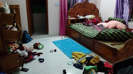 ডাকাদের প্রত্যেকের হাতে ছিল অস্ত্র এবং তাদের মুখ ছিল কালো কাপড়ে বাঁধা। ডাকাতরা বাসায় ঢুকে গৃহবধূ সুমি আক্তার, শাশুড়ী সাজেদা ও ভাসুর দিদার হোসেনকে পিস্তল মাথায় ঠেকিয়ে
