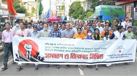 বাংলাদেশ হিন্দু বৌদ্ধ খ্রীস্টান ঐক্য পরিষদ সিলেট জেলা ও মহানগর শাখার যৌথ উদ্যোগে শনিবার কোর্ট পয়েন্টে আয়োজিত সমাবেশ সভাপতির বক্তব্যে তিনি উপরোক্ত কথাগুলো বলেন।সভায় বক্তারা বলেন, নির্বাচনী প্রতিশ্রুতি বাস্তবায়নের জন্য কোন সভ্য দেশে আন্দোলন করতে হয় না। বক্তারা সাম্প্রদায়িক নিপীড়ন-নির্যাতনের প্রতিটি ঘটনার দৃষ্টান্তমূলক শাস্তির দাবী জানান। সমাবেশ শেষে একটি বিক্ষোভ মিছিল সিলেট কেন্দ্রীয় শহীদ মিনারে গিয়ে শেষ হয়।হিন্দু বৌদ্ধ খ্রীস্টান ঐক্য পরিষদ এক্য পরিষদ সিলেট মহানগর শাখার সভাপতি এডভোকেট মৃত্যুঞ্জয় ধর ভোলার সভাপতিত্বে ও জেলা শাখার সাধারণ সম্পাদক কৃপেশ পাল এবং মহানগর সাধারণ সম্পাদক প্রদীপ কুমার দের যৌথ পরিচালনায় সমাবেশে বক্তব্য রাখেন ঐক্য পরিষদের কেন্দ্রীয় সাংগঠনিক সম্পাদক মলয় পুরকায়স্থ, পূজা উদযাপন পরিষদের কেন্দ্রীয় উপদেষ্টা প্রফেসর ড. হিমাদ্রি শেখর রায়, কেন্দ্রীয় সাংগঠনিক সম্পাদক অধ্যাপক রজত কান্তি ভট্টাচার্য্য,