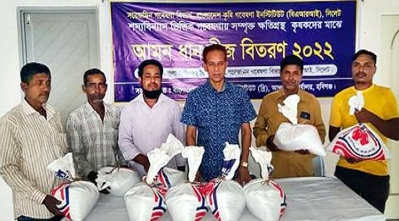 বীজ বিতরণ করেন সগবি, বিএমআরই সিলেটের প্রধান বৈজ্ঞানিক কর্মকর্তা ডঃ মাহমুদুল ইসলাম নজরুল।এসময় সিলেটের বিভিন্ন এলাকার মাঠ পর্যায়ের গবেষণার সাথে সম্পৃক্ত ক্ষতিগ্রস্ত ১৫ জন কৃষকের মাঝে উচ্চ ফলনশীল আমন ধানের বীজ বিতরণ করা হয়।