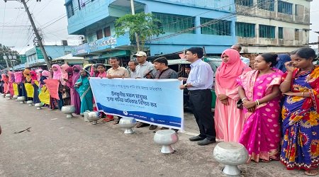 নোয়াখালী প্রতিনিধি : ‘বিনা মূল্যে নিরাপদ ও পর্যাপ্ত সুপেয় পানি প্রাপ্তি আমার অধিকার’ এ প্রতিপাদ্যে নোয়াখালীর সুবর্ণচরে উপকূলীয় সকল মানুষের সুপেয় পানির অধিকার নিশ্চিত করার দাবিতে মানববন্ধন অনুষ্ঠিত হয়েছে। এসময় মানববন্ধনকারীরা সড়কে খালি কলসি রেখে প্রতিবাদ জানায়।রোববার (১৪ আগস্ট) বেলা ১১টায় উপজেলা পরিষদ সংলগ্ন মুক্তিযোদ্ধা চত্ত্বরে অবস্থান নিয়ে এ কর্মসূচী পালন করে ভুক্তভোগি স্থানীয় এলাকাবাসী।মানববন্ধনে বক্তব্য রাখেন, মো. সাইফুল ইসলাম সুমন, কেফায়েত উল্যা, জাকির হোসেন, সাংবাদিক আবদুল বারি বাবলুসহ আরও অনেকে।