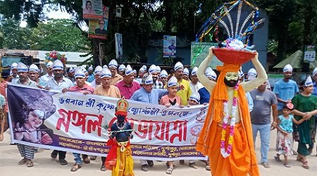 তোবারক হোসেন খোকন,দুর্গাপুর(নেত্রকোনা)প্রতিনিধি : নেত্রকোনার দুর্গাপুরে উপজেলা পূঁজা উদ্যাপন কমিটির আয়োজনে ও শ্রী শ্রী দশভূজা মন্দির পরিচালনা কমিটির সহযোগিতায় শ্রীকৃষ্ণের জন্মাষ্টমী পালিত হয়েছে। শুক্রবার দিনব্যাপি এ দিবস পালিত হয়।দিনব্যাপী অনুষ্ঠানের মধ্যে ছিল কৃষ্ণ পূজা ও গীতা পাঠ শেষে উপজেলার বিভিন্ন এলাকা হতে আগত সনাতন ধর্মালম্বীদের অংশগ্রহনে শ্রী শ্রী দশভূজা মন্দির প্রাঙ্গন হতে এক বর্ণাঢ্য শোভাযাত্রা পৌর শহরের বিভিন্ন সড়ক প্রদক্ষিন শেষে মন্দির প্রাঙ্গনে উপজেলা পূঁজা উদ্যাপন কমিটির সভাপতি এডভোকেট মানেশ চন্দ্র সাহা এর সভাপতিত্বে উপজেলা পূঁজা উদ্যাপন পরিষদের সাধারন সম্পাদক নির্মলেন্দু সরকার বাবুল এর সঞ্চালনায় শ্রী কৃষ্ণের জীবনীর উপর আলোচনা সভায় প্রধান অতিথি ছিলেন উপজেলা আওয়ামীলীগের সভাপতি বীর মুক্তিযোদ্ধা আলা উদ্দিন আল আজাদ।
