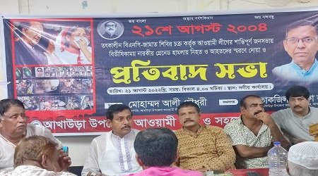 প্রতিবাদ সভায় উপজেলা আওয়ামী লীগের সভাপতি মোহাম্মদ আলী চৌধুরীর সভাপতিত্বে ও সাধারণ সম্পাদক পৌর মেয়র তাকজিল খলিফা কাজলের সঞ্চালনায় বক্তব্য রাখেন উপজেলা আওয়ামী লীগের সাবেক সাধারণ সম্পাদক মনির হোসেন বাবুল, সাবেক যুগ্ম আহ্বায়ক সেলিম ভুঁইয়া, পৌর আওয়ামী লীগের সভাপতি অ্যাডভোকেট আব্দুল্লা ভুইয়া বাদল, উপজেলা যুবলীগের যুগ্ম আহ্বায়ক আব্দুল মমিন বাবুল, আখাউড়া পৌর যুবলীগ সভাপতি মনির খান, বাংলাদেশ মানবাধিকার কমিশনের আখাউড়া উপজেলা শাখার সাধারণ সম্পাদক জুয়েল রানা, উত্তর ইউনিয়ন পরিষদ চেয়ারম্যান মোঃ শাহজাহান,