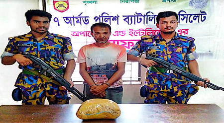 শহিদ আহমেদ খান সাবের,সিলেট প্রতিনিধি : সিলেট মহানগরের দক্ষিণ সুরমা এলাকা থেকে ১ কেজি গাঁজাসহ এক মাদক ব্যবসায়ীকে আটক করেছে আর্মড পুলিশ ব্যাটালিয়ান, এপিবিএন-৭। মঙ্গলবার গোপন সংবাদের ভিত্তিতে ৭ এপিবিএন সিলেটের অধিনায়ক (অ্যাডিশনাল ডিআইজি)’র নির্দেশনায় দক্ষিণ সুরমা থানার রশিদপুর এলাকায় অবৈধ মাদক দ্রব্য ও বিশেষ অভিযান পরিচালনা করে এপিবিএন-৭ এর একটি চৌকস দল। অভিযানে আব্দুল আহাদ (৪৫) নামের এক চিহ্নিত মাদক ব্যবসায়ীকে আটক করা হয়। এসময় তার কাছ থেকে ১ কেজি গাঁজা উদ্ধার ও জব্দ করা হয়।