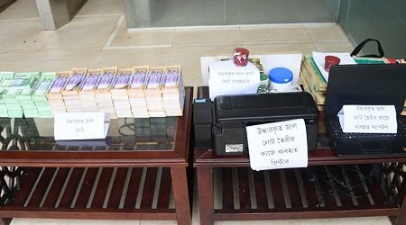 এসময় তাদের কাছ থেকে ৬ লাখ টাকা মূল্যমানের জাল টাকা উদ্ধার করা হয়। তাদের দেয়া তথ্যের ভিত্তিতে গাজীপুর মহানগরের গাছা থানা এলাকায় অভিযান চালিয়ে আরও ৯৪ লাখ ২৫ হাজার টাকার জাল নোট এবং জাল টাকা তৈরির কাজে ব্যবহৃত ১টি ল্যাপটপ, ১ টি কালার প্রিন্টার, ২টি পারটেক্স বোর্ড ও ৫টি ডাইসসহ অন্যান্য সরঞ্জামাদি জব্দ করা হয়।