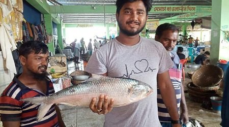 সোমবার রাতে আলীপুর বিএফডিসি মৎস্য মার্কেটে এই রাজা ইলিশটি বিক্রির উদ্দেশ্যে নিয়ে আসেন জেলে বশির। এসময় মাছটি এক নজর দেখতে স্থানীয়রা ভিড় জমান।