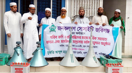 এসময় সোসাইটি পক্ষ হতে আব্দুল্লাহ বিন মাসউদ রা. কওমী মাদ্রাসা খিলোগ্রাম এবং বায়তুন নূর জামে মসজিদ সালেহপুর’র জন্য প্রায় ৬৮ হাজার টাকা মুল্যের দুইসেট মাইকও প্রদান করা হয়। অনুষ্ঠানে আগত জকিগঞ্জ উপজেলা তথা ঘোটা বাংলাদেশেু রতœগর্বা কৃতি সন্তান প্রধান অতিথি মুফতি আব্দুল মান্নান সাহেবের মুবারক হস্তে এসব নগদ টাকা এবং মাইক অনুদানের অনুষ্ঠানিকতা সম্পন্ন করা হয়।