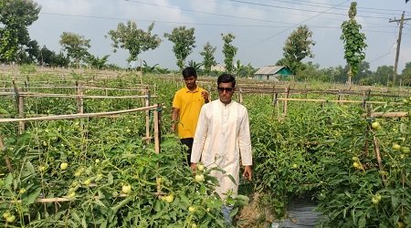 বাদল আহাম্মদ খান,ব্রাহ্মণবাড়িয়া জেলা প্রতিনিধি : নিজস্ব মেধা ও পরিকল্পনায় আগাম জাতের টমেটো চাষে সফল ব্রাহ্মণবাড়িয়ার আপন দুই ভাই। তারা হলেন ব্রাহ্মণবাড়িয়া সদর উপজেলার মাছিহাতা ইউনিয়নের ৯নং ওয়ার্ডের চিনাইর গ্রামের দুই ভাই মেহেদী হাসান ও জামির হোসেন। জানা গেছে শখের বশবর্তী হয়ে আগাম জাতের বারি-৮ টমেটোর প্রজেক্ট করে এখন লাভের স্বপ্ন দেখছেন তারা। চিনাইর প্রধান সড়ক দিয়ে ঘাটিয়ারা যাওয়ার রাস্তার পাশে প্রায় তিন বিঘা জমি লিজ নিয়ে মালচিং পদ্ধতিতে এ কৃষি প্রজেক্ট তৈরি করেন তারা। বারি-৮ টমেটোর জাতটি উচ্চফলনশীল হওয়ায় চারা লাগানোর দুই মাসের মধ্যেই গাছে টমেটো আসতে শুরু করে, প্রতিটি গাছে গড়ে ৮ থেকে ১০ কেজি করে টমেটো পাওয়া যায় বলে জানান মেহেদি হাসান ও জামির হোসেন ।