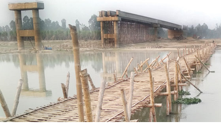 মোঃ আফজাল হোসেন, দিনাজপুর প্রতিনিধি : দিনাজপুরের নবাবগঞ্জ ও পীরগঞ্জের জয়ন্তিপুর ঘাটের সেতু নির্মাণ সম্পন্ন না হওয়ায় বাঁশের লম্বা সাঁকোতে পারাপার হচ্ছে দুই উপজেলার শতশত নারী পুরুষ। তবে কর্তৃপক্ষ বলেছে, অল্প দিনের মধ্যেই নির্মাণ কাজ শেষ হলেই আলোর মুখ দেখবে সেতুটি। বর্তমানে জোরে সোরে কাজ শুরু করেছে নির্মাণাধীন ঠিকাদারি প্রতিষ্ঠান।করোনার কারণে দীর্ঘদিন বন্ধ থাকার পর আবার পুরোদমে নির্মাণ কাজ শুরু হয়েছে রংপুরের পীরগঞ্জ উপজেলার করতোয়া নদীতে জয়ন্তীপুর ঘাটে নির্মাণাধীন ব্রিজ। সেতুটি নির্মিত হলে রংপুরসহ নবাবগঞ্জ হয়ে দিনাজপুর ও হিলি স্থলবন্দরসহ জয়পুরহাটে যোগাযোগ ব্যবস্থার উন্নয়ন হবে। দেশে করোনা দেখা দেওয়ায় যথাসময়ে সেতুটি নির্মাণ করে জনসাধারণের ব্যবহার সম্ভব হয়নি।