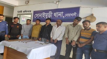 গ্রেপ্তারকৃতরা হলেন, লক্ষ্মীপুরের রায়পুর উপজেলার কাঞ্চনপুর গ্রামের ছানা উল্যার ছেলে খোরশেদ আলম টিপু (৩৭), ফেনীর সোনাগাজী উপজেলার চরচান্দিয়ার মহিষচর গ্রামের নূর নবীর ছেলে নূর কাশেম মোহন (২৬), ভোলার তজুমুদ্দির দক্ষিণ চাচড়া গ্রামের সোলো মাঝির ছেলে ইউছুফ (৩৫), নোয়াখালীর সুবর্ণচর উপজেলার উত্তর ব্যা¹া গ্রামের গিয়াস উদ্দিনের ছেলে ফারুক (৪০), বেগমগঞ্জের ছয়ানী ইউনিয়রে বড় মেহেদীপুর গ্রামের আবদুস সোবহানের ছেলে মুরাদ হোসেন (২৫), সদর উপজেলার দাউদপুর গ্রামের মনশাদ হানিফের ছেলে রুবেল (২৬) ও সেনবাগের গাজীরহাট গ্রামের সেলিম উদ্দিনের ছেলে নূর ইসলাম (৩৫)। সোমবার (২১ নভেম্বর) দুপুর সাড়ে ১২টার দিকে নিজ কার্যালয়ে এক সংবাদ সম্মেলনে এসব তথ্য নিশ্চিত করেন নোয়াখালী পুলিশ সুপার মো. শহীদুল ইসলাম।পুলিশ জানায়, গত ২৭অক্টোবর রাতে সোনাইমুড়ী পৌরসভার ৬নং ওয়ার্ড পূর্বপাড়া চাঁদ মিয়া বেপারি বাড়ির জাকির হোসেনের বাড়িতে ডাকাতির ঘটনা ঘটে। ডাকাতিকালে ১০/১৫ জনের একদল ডাকাত ওই বাড়ির জাকিরের বসত ঘরের দরজা ভেঙে ভিতরে প্রবেশ করে অস্ত্রের মুখে ঘরে থাকা লোকজনকে জিম্মি করে এবং বেঁধে ফেলে। পরে ডাকাতদল ওই ঘর থেকে প্রায় ৩১ভরি স্বর্ণ, দুটি ডায়মন্ড সেট, নগদ ৬লাখ ৮৫হাজার টাকা সহ প্রায় ৩৭লাখ টাকার মালামাল লুট করে নিয়ে যায়। এ ঘটনায় গত ২৮ অক্টোবর থানায় একটি মামলা দায়ের করেন ভুক্তভোগি।অভিযোগের ভিত্তিতে পুলিশ সুপার মো. শহীদুল ইসলামের তত্ত্বাবধানে ও সোনাইমুড়ী থানার ওসি জিয় উল হকের নেতৃত্বে রোববার রাতে নোয়াখালী, ফেনী ও চট্টগ্রামের পৃথক স্থানে অভিযান চালিয়ে ৭ ডাকাত সদস্যকে গ্রেপ্তার করা হয়। পরে তাদের দেওয়া তথ্যের ভিত্তিতে বিভিন্ন স্বর্ণের দোকান থেকে স্বর্ণগুলো ও তাদের হেফাজত থেকে অস্ত্রগুলো উদ্ধার করা হয়। আসামিদের সোমবার দুপুরে নোয়াখালী চীফ জুডিশিয়াল ম্যাজিস্ট্রেট আদালতে সোপর্দ করা হয় ।