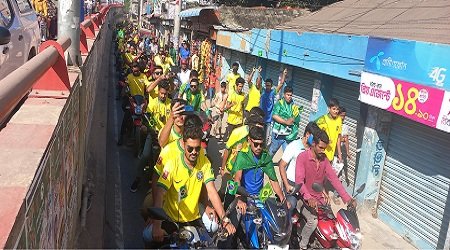 তারা পৃথিবীর বিভিন্ন দেশের নামী দামি ক্লাবে খেলে থাকেন। ছোট বেলা থেকেই ব্রাজিলকে সমর্থন করি। আশা করি এবারের চ্যাম্পিয়ন ট্রফি শোভা পাবে নেইমারের হাতে।’ শোভাযাত্রার অন্যতম আয়োজক মো. বাহাদুর আলম বলেন, ‘ফেসবুকের মাধ্যমে আমরা সবাই যোগাযোগ করে এই আনন্দ র্যালির আয়োজন করেছি।’ দলটি এবার চ্যাম্পিয়ন হওয়ার শতভাগ আশা ব্যক্ত করে এক প্রশ্নের জবাবে তিনি বলেন, ‘ব্রাজিল মানেই একটি অনুভ‚তি ও ভালোবাসার নাম।