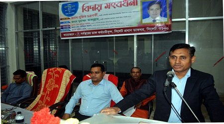 (২৩ নভেম্বর) বুধবার বিকাল ৪টায় বন্দরবাজারস্থ সিলেট প্রধান ডাকঘরের সর্বস্থরের ডাক কর্মচারীবৃন্দের উদ্যোগে সিলেট প্রধান ডাকঘরের সহকারী পোস্টমাস্টার জেনারেল কাম-পোস্টমাস্টার সুজিত চক্রবর্তী এর বদলী জনিত বিদায় উপলক্ষে আয়োজিত সংবর্ধনা অনুষ্ঠানে প্রধান অতিথির বক্তব্যে উপরোক্ত কথাগুলো বলেন।সিলেট প্রধান ডাকঘরের সহকারী পোস্টমাস্টার জেনারেল কাম-পোস্টমাস্টার (ট্রেজারী) সুদীপ ঘোষের সভাপতিত্বে ও সিলেট প্রধান ডাকঘরের পোস্ট অফিস পরিদর্শক রুনু চক্রবর্তীর পরিচালনায় সংবধির্ত অতিথির বক্তব্য রাখেন সিলেট প্রধান ডাকঘরের সহকারী পোস্টমাস্টার জেনারেল কাম-পোস্টমাস্টার সুজিত চক্রবর্তী। সুজিত চক্রবর্তী তার বক্তব্যে সিলেট প্রধান ডাকঘরের সকল কর্মকর্তা কর্মচারীর প্রতি আন্তরিক অভিনন্দন জানিয়ে বলেন, আমার কর্মময় দিনগুলোতে আপনাদের সার্বিক সহযোগিতা আজীবন স্মরণীয় হয়ে থাকবে। তিনি সকলের কাছে কৃতজ্ঞতা এবং দোয়া কামনা করেন। অনুষ্ঠানের শুরুতে পবিত্র কালামে পাক থেকে তেলাওয়াত করেন হাফিজ মাওলানা মো: রফিকুল ইসলাম। গীতা পাঠ করেন প্রশাসন শাখার ডেপুটি পোস্টমাস্টার বিপুল চন্দ্র মালাকার। মানপত্র পাঠ করেন সিলেট প্রধান ডাকঘরের পোস্টাল অপারেটর খাদিজা ইয়াসমিন খাঁন।অন্যান্যের মধ্যে বক্তব্য রাখেন, সিলেট বিভাগের সুপার মলয় কান্তি সরকার, মো: বদিউজ্জামান, কুলাউড়া উপ-বিভাগের পরিদর্শক লিপ্টন রঞ্জন রায়, সিলেট প্রধান ডাকঘরের ডেপুটি পোস্টমাস্টার বিপুল চন্দ্র মালাকার, সহকারী পোস্ট মাস্টার ও উপজেলা পোস্ট মাস্টার এসোসিয়েশন সিলেট বিভাগের সাধারণ সম্পাদক সৈয়দ মুত্তাকিম আলী, পোস্ট অফিস কর্মচারী ইউনিয়ন সিলেট-সুনামগঞ্জ জেলা শাখার সভাপতি মধুসুদন বনিক, সাধারণ সম্পাদক মজিবুর রহমান খান পাঠান, পোস্টম্যান ও ডাক কর্মচারী ইউনিয়ন সিলেট, সুনামগঞ্জ ও আংশিক মৌলভীবাজার শাখার সাধারণ সম্পাদক দুলন রঞ্জন দেব, সিলেট প্রধান ডাকঘরের লেপক রঞ্জন তালুকদার, সহকারী পোস্টমাস্টার মনোয়ার হোসেন, পোস্টাল অপারেটর মো: ফখরুজ্জামান, আবু তাহের, পোস্টম্যান মো: ফুকন মিয়া প্রমুখ। অনুষ্ঠানে বিদায়ী পোস্টমাস্টার সুজিত চক্রবর্তী ও প্রধান অতিথি সিলেট বিভাগের ডেপুটি পোস্টমাস্টার জেনারেল মুহাম্মদ আবদুল্লাহকে সর্বস্তরের ডাক কর্মচারীদের পক্ষ থেকে ক্রেস্ট, ফুল ও উপহার সামগ্রী তুলে দেয়া হয়। পরে এক মনোজ্ঞ সাংস্কৃতিক অনুষ্ঠান অনুষ্ঠিত হয়।