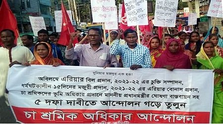 শহিদ আহমেদ খান সাবের,সিলেট প্রতিনিধি : অবিলম্বে চা শ্রমিকদের (২০২১-২০২২) চুক্তি সম্পন্ন করা, ২০ মাসের এরিয়ার, ধর্মঘটকালীন মজুরী ও বোনাসের এরিয়ার টাকা প্রদান করা সহ ৫ দফা দাবীতে চা শ্রমিক অধিকার আন্দোলন কেন্দ্রীয় কমিটির উদ্যোগে ২ ডিসেম্বর শুক্রবার বিকাল ৪ টায় সিলেট নগরীতে মিছিল ও সমাবেশ অনুষ্ঠিত হয়েছে।৫ দফা দাবীর ভিত্তিতে বাগানে বাগানে প্রচারপত্র বিতরণ, লাইন বৈঠক কর্মসূচি পালন সহ ধারাবাহিক কর্মসূচির অংশ হিসেবে শুক্রবার চা শ্রমিকদের ৫ দফা দাবীতে প্লেকার্ড, ফেস্টুন সম্বলিত মিছিলটি মালিনীছড়া চা-বাগান থেকে শুরু হয়ে সিলেট কেন্দ্রীয় শহীদ মিনারে এসে সমাবেশে মিলিত হয়।