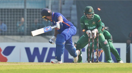 স্পোর্টস ডেস্ক : বাংলাদেশ সফরে এসেই পরাজয় দেখল ভারতীয় ক্রিকেট দল। ক্রিকেট বিশ্বের এই পরাশক্তিধর দলটির ব্যাটিং লাইনআপ রীতিমতো ধসিয়ে দেন সাকিব আল হাসান ও পেস বোলার এবাদত হোসেন। সাকিবের স্পিন আর এবাদতের গতির মুখে পড়ে ৪১.২ ওভারে ১৮৬ রানে অলআউট হয় ভারত।