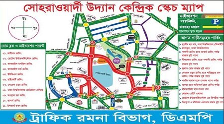 সোহরাওয়ার্দী উদ্যানের আশপাশের এলাকায় চলাচলের ক্ষেত্রে নগরবাসীকে ভিন্ন রাস্তা ব্যবহার করতে ঢাকা মেট্রোপলিটন পুলিশের পক্ষ থেকে অনুরোধ জানানো হয়েছে।
