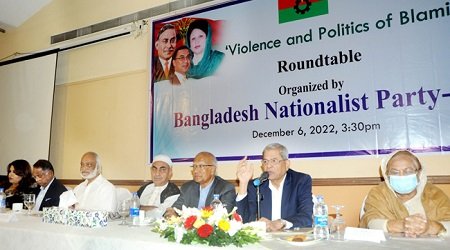 ‘ভায়োলেন্স অ্যান্ড পলিটিক্স অব ব্লেমিং’ শীর্ষক গোলটেবিল আলোচনা সভার আয়োজন করে বাংলাদেশ জাতীয়তাবাদী দল-বিএনপি। দলের মহাসচিব মির্জা ফখরুল ইসলাম আলমগীরের সভাপতিত্বে ও বিএনপি নেতা শামা ওবায়েদ ও অ্যাডভোকেট ফারজানা শারমিন পুতুলের পরিচালনায় সভায় অংশ নেন- বিএনপির ড. খন্দকার মোশাররফ হোসেন, মির্জা আব্বাস, গয়েশ্বর চন্দ্র রায়, ড. আবদুল মঈন খান, বেগম সেলিমা রহমান, ইকবাল হাসান মাহমুদ টুকু, আব্দুল্লাহ আল নোমান, মেজর (অব.) হাফিজ উদ্দিন আহমেদ, মীর মোহাম্মদ নাছির, ব্যারিস্টার শাহজাহান ওমর, আব্দুল আউয়াল মিন্টু, জয়নুল আবদীন ফারুক, আলতাফ হোসেন চৌধুরী, নিতাই রায় চৌধুরী, অ্যাডভোকেট জয়নাল আবেদীন, বরকত উল্লাহ বুলু, মো: আবদুস সালাম, ড. এনামুল হক চৌধুরী, ড. শাহিদা রফিক, ইসমাইল জবিউল্লাহ, আব্দুল কাইয়ুম, বিজন কান্তি সরকার, মজিবুর রহমান সারোয়ার, সৈয়দ মোয়াজ্জেম হোসেন আলাল, খায়রুল কবির খোকন, শামসুর রহমান শিমুল বিশ্বাস, ফজলুল হক মিলন, শহীদ উদ্দীন চৌধুরী এ্যানি, জহির উদ্দিন স্বপন, অ্যাডভোকেট আসাদুজ্জামান, কাদের গণি চৌধুরী, তাইফুল ইসলাম টিপু, ব্যারিস্টার মীর হেলাল, তাবিথ আউয়াল, নায়াব ইউসুফ, এ বি এম আবদুস সাত্তার, শায়রুল কবির খান প্রমুখ।