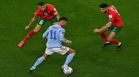ডেস্কনিউজঃ কাতার বিশ্বকাপে কোয়ার্টার ফাইনাল নিশ্চিত করতে নক আউট পর্বের লড়াইয়ে মরক্কোর বিপক্ষে গোলশূন্য থেকে প্রথমার্ধ শেষ করেছে স্পেন । মঙ্গলবার (৬ ডিসেম্বর) বাংলাদেশ সময় রাত ৯ টায় এডুকেশন সিটি স্টেডিয়ামে মাঠে নামছে এই দু’দল। ম্যাচের শুরু থেকেই আক্রমণ-পাল্টা আক্রমণে খেলতে থাকে মরক্কো ও স্পেন। বেশ কিছু সুযোগ পেলেও গোল করতে ব্যর্থ হয় দু’দল। শেষ পর্যন্ত কোন গোল না হলে গোলশূন্য থেকেই বিরতিতে যায় স্পেন ও মরক্কো।