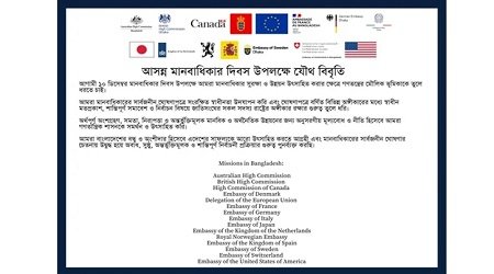 আজ (মঙ্গলবার) ঢাকাস্থ মার্কিন দূতাবাস সামাজিক যোগাযোগমাধ্যমে ইংরেজি ও বাংলা দুই ভাষাতেই বিবৃতিটি প্রকাশ করেছে। অস্ট্রেলিয়ান হাইকমিশন, বৃটিশ হাইকমিশন,কানাডিয়ান হাইকমিশন, ডেনমার্ক দূতাবাস, ইউরোপীয় ইউনিয়ন ডেলিগেশন, ফ্রান্স দূতাবাস, জার্মান দূতাবাস, ইটালির দূতাবাস, জাপান দূতাবাস, নেদারল্যান্ডস দূতাবাস, নরওয়ে দূতাবাস, স্পেন দূতাবাস, সুইডিশ দূতাবাস, সুইজারল্যান্ড দূতাবাস ও যুক্তরাষ্ট্র দূতাবাসের যৌথ বিবৃতিতে বলা হয়েছেঃ