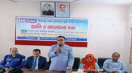 মোঃ আফজাল হোসেন, দিনাজপুর প্রতিনিধি : দিনাজপুরের বীরগঞ্জ উপজেলা প্রশাসনের আয়োজনে সকাল ১১ টায় উপজেলা পরিষদ থেকে একটি বণাঢ্য র্যালী পৌর শহরের প্রধান প্রধান সড়ক প্রদক্ষিন শেষে শহীদ বুধারু নামক ফলকে ও শহীদ মহসীন কবরে পুস্প অর্পণ শেষে বীরগঞ্জ উপজেলা পরিষদ হলরুমে উপজেলা নির্বাহী অফিসার জিনাত রেহানার সভাপতিত্বে প্রধান অতিথি হিসেবে বক্তব্য রাখেন উপজেলা পরিষদের চেয়ারম্যান মোঃ আমিনুল ইসলাম।