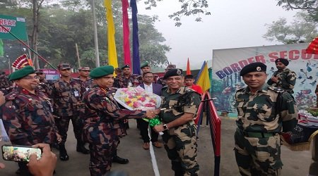 বাদল আহাম্মদ খান ,ব্রাহ্মণবাড়িয়া জেলা প্রতিনিধি : বিজয় দিবস উপলক্ষে বৃহস্পতিবার বিকেলে ব্রাহ্মণবাড়িয়ার আখাউড়া স্থলবন্দরের নো-ম্যালসল্যান্ডে বর্ডার গার্ড বাংলাদেশ (বিজিবি) ও বর্ডার সিকিউরিটি ফোর্স (বিএসএফ’র) মধ্যে ‘জয়েন্ট রিট্রিট সিরিমনি’ অনুষ্ঠিত হয়েছে। এ সময় দু’পক্ষের মধ্যে মিষ্টি ও গাছ বিনিময় হয়।বেলা সাড়ে চারটার দিকে বাংলাদেশের পক্ষ থেকে বিএসএফ’র হাতে মিষ্টি তুলে দেয় বিজিবি। ভারতীয় বিএসএফ’র পক্ষ থেকে বিজিবিকে দেওয়া হয় গাছের চারা। পরে বিউগলের সুরে দু’দেশের পতাকা একসঙ্গে নামানো হয়, যা ‘জয়েন্ট রিট্রিট সিরিমনি’ হিসেবে পরিচিত। দু’দেশের শত শত মানুষ এ সুন্দর আয়োজন উপভোগ করেন।