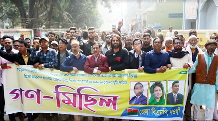 গণ মিছিল ও সমাবেশে সভাপতিত্ব করেন, নওগাঁ জেলা বিএনপির আহব্বায়ক আবু বক্কর সিদ্দিক নান্নু, জেলা বিএনপির সাবেক সভাপতি ও পৌর মেয়র নজমুল হক সনি, সাবেক সাধারণ সম্পাদক জাহিদুল ইসলাম ধলু, যুগ্ম আহব্বায়ক শহিদুল ইসলাম, মামুনুর রহমান রিপন, সদস্য সচিব বায়েজিদ হোসেন পলাশ, শেখ রেজাউল ইসলাম, আমিনুল হক, শফিউল আজম রানা, বিএনপি নেতা খাজা নাজিবুল্লাহ, মহিলা দলের সভাপতি সিমা চৌধুরী, জেলা যুবদলের ভারপ্রপ্ত সভাপতি দেওয়ান ফারুক, স্বেচ্ছাসেবক দলের সাধারণ সম্পাদক শফিউল আজম টুটুল, ছাত্র দলের সভাপতি রুবেল হোসেনসহ অঙ্গ সংগঠণের নেত্রী বৃন্দর উপস্থিত ছিলেন।