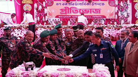 মিজানুর রহমান মিন্টু জয়পুরহাট প্রতিনিধি : বিভিন্ন কর্মসূচীর মধ্যদিয়ে জয়পুরহাট ২০ বিজিবি ব্যাটালিয়নের ৪৭ তম প্রতিষ্ঠা বার্ষিকী পালিত হয়েছে। দিবসটি উপলক্ষে সকালে ২০ বিজিবি ব্যাটালিয়ন সদর দপ্তরে জাতীয় পতাক উত্তোলন, দোয়া অনুষ্ঠান ও বিশেষ দরবার অনুষ্ঠিত হয়। পরে দুপুরে প্রীতি ভোজ অনুষ্ঠানে প্রতিষ্ঠা বার্ষিকীর কেক কেটে প্রধান অতিথি’র বক্তব্য দেন রংপুর রিজিয়ন কমান্ডার ব্রিগেডিয়ার জেনারেল এ বি এম নওরোজ এহসান।