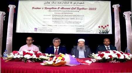 জালাল আহমদ,ঢাবি প্রতিনিধি : ঢাকা বিশ্ববিদ্যালয়ের উর্দু বিভাগের ১ম বর্ষ স্নাতক (সম্মান) শ্রেণির শিক্ষার্থীদের নবীন বরণ ও বিভাগের অ্যালামনাইদের পুনর্মিলনী অনুষ্ঠান আজ ২৯ ডিসেম্বর(২০২২) বৃহস্পতিবার ছাত্র-শিক্ষক কেন্দ্র(টিএসসি ) মিলনায়তনে অনুষ্ঠিত হয়েছে। অনুষ্ঠানে বিশ্ববিদ্যালয়ের প্রো-ভাইস চ্যান্সেলর (প্রশাসন) অধ্যাপক ড. মুহাম্মদ সামাদ প্রধান অতিথি হিসেবে উপস্থিত ছিলেন।বিভাগীয় চেয়ারম্যান অধ্যাপক ড. মো. রেজাউল করিমের সভাপতিত্বে অনুষ্ঠানে বিশ্ববিদ্যালয়ের কোষাধ্যক্ষ অধ্যাপক মমতাজ উদ্দিন আহমেদ বিশেষ অতিথি হিসেবে বক্তব্য রাখেন।