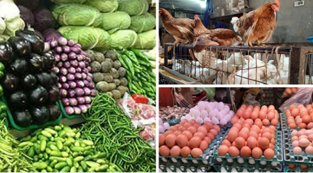 ফার্মের মুরগির ডিমের দাম বাড়ছেই। ডজন বিক্রি হচ্ছে ১৩০ থেকে ১৩২ টাকায়। এক সপ্তাহ আগে ডজন বিক্রি হতো ১২৫ টাকায়। হাঁসের ডিমের ডজন ২১০-২২০ টাকা আর দেশি মুরগির ডিমের ডজন ১৮০-১৯০ টাকা। বাজারে গরুর মাংসের কেজি ৬৮০-৭০০ টাকা। খাসি ৯০০-১০০০ টাকায়। দাম বেড়েছে মুরগির। ব্রয়লার মুরগির কেজি ১৭০ থেকে ১৮০ টাকায় বিক্রি হচ্ছে। গত সপ্তাহে ছিল ১৫০ থেকে ১৬০ টাকা। সোনালি মুরগির কেজি ৩০০-৩১০ টাকা। লেয়ার মুরগির কেজি ২৫০-২৬০ টাকা।