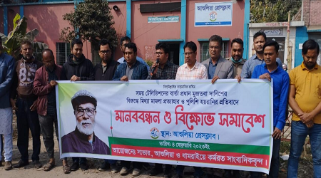 আশুলিয়া প্রেসক্লাবের সভাপতি ও সময় টেলিভিশনের স্টাফ রিপোর্টার মোজাফফর হোসেন জয়ের সভাপতিত্বে মানববন্ধন কর্মসূচির সঞ্চালনা করেন আশুলিয়া প্রেসক্লাবের সাধারণ সম্পাদক এশিয়ান টেলিভিশনের স্টাফ রিপোর্টার জহিরুল ইসলাম খান লিটন। এ সময় বক্তারা বলেন, বর্তমান সময়ে সরকারের ভাবমূর্তি ক্ষুণ্ন করতে একটি মহল সরকারের খেয়ে পরে বিভিন্ন ভাবে উস্কানীমূলক কাজে লিপ্ত আছে। সাংবাদিকদের বিরুদ্ধে বিভিন্ন ভাবে মামলা দিয়ে হয়রানি করে আলোচনায় ফেলতে চায়। সম্প্রতি বাংলাদেশের বেসরকারি স্যাটেলাইট টেলিভিশন সময় টিভির বার্তা প্রধান মুজতবা দানিশের বিরুদ্ধে একটি মামলা দিয়ে হয়রানি করা হচ্ছে। দেশের এই প্রথম সারির গণমাধ্যমের কন্ঠরোধ করার লক্ষে এই মামলা দিয়ে হয়রানি করা হচ্ছে বলে মনে করেন সাংবাদিকরা।