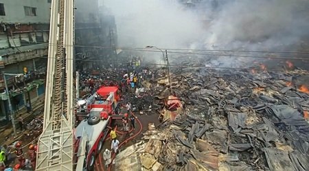 সাড়ে ৬ ঘণ্টার আগুনে পুড়ে ছাই হয়ে গেছে রাজধানীর বঙ্গবাজার মার্কেট। আগুনে পুড়ে নিশ্চিহ্ন হয়েছে দেশের অন্যতম বৃহৎ এ পাইকারি মার্কেটের ৫ হাজার দোকান। ঈদের আগে পুঁজি হারিয়ে পথে বসেছেন হাজারো ব্যবসায়ী। ক্ষতিগ্রস্ত ব্যবসায়ীরা বলছেন, এ আগুনে ছাই হয়েছে অন্তত ১ হাজার কোটি টাকার সামগ্রী। রক্ষা পায়নি পুলিশ সদর দফতরও। গতকাল সকাল ৬টা ১০ মিনিটে শুরু হওয়া আগুন দ্রুত ছড়িয়ে পড়ায় তলব করা হয়েছিল সেনাবাহিনী, নৌবাহিনী ও বিমানবাহিনীর অগ্নিনির্বাপক ইউনিটকে।
