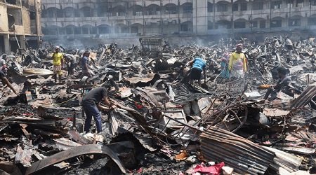 ডেস্ক নিউজ : রাজধানী ঢাকার বঙ্গবাজারে ধ্বংসস্তূপে এখনো জ্বলে উঠছে আগুন, বের হচ্ছে ধোঁয়া। এতে ধ্বংসস্তূপ সরানোর কাজে ব্যাঘাত ঘটছে। ধ্বংসস্তূপের পাশাপাশি এনেক্সকো টাওয়ারের ভেতরেও আগুন দেখা গেছে। পোড়া কাপড়ের ভেতর থেকে এই আগুন জ্বলছে বলে জানিয়েছেন প্রত্যক্ষদর্শীরা। অথচ অগ্নিকাণ্ডের ৭৫ ঘণ্টা পর ফায়ার সার্ভিস সম্পূর্ণ নির্বাপণের ঘোষণা দেয়। ফায়ার সার্ভিসের আগুন নেভানোর ঘোষণার পর শুক্রবার সকাল ১০টা থেকে বঙ্গবাজার ধ্বংসস্তূপ থেকে বর্জ্য অপসারণ শুরু হয়। অবশ্য এই বর্জ্য অপসারণ করতে কয়দিন লাগবে তা জানাতে পারেননি কেউ।