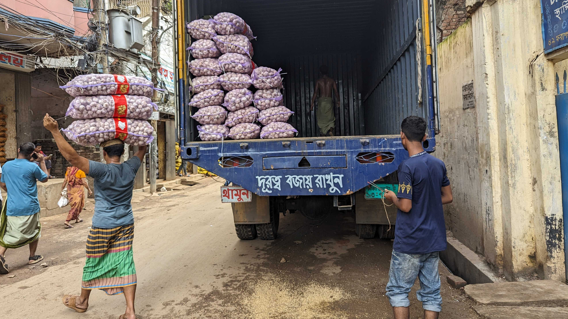 ট্রাক থেকে আড়তে নেয়া হচ্ছে রসুন। ছবি: বিশ্বজিৎ দাস বিজয়