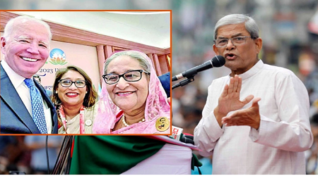 মির্জা ফখরুল ইসলাম আলমগীর বলেন, ‘এত ব্যানক্রাফট, এত দেউলিয়া, এত নিঃস্ব হয়ে গেছেন আপনারা যে বাইডেনের সঙ্গে একটা সেলফি তুলে এখন ঢাকঢোল পেটাচ্ছেন- আহা আমরা জিতে গেছি। জেতাবে তো বাংলাদেশের মানুষ ভোটের মাধ্যমে। সেই ভোটটা ঠিকমতো হওয়ার ব্যবস্থা করেন। তা না হলে কোনো বাইডেনেই আপনাদের রক্ষা করতে পারবে না, সেলফিও রক্ষা করতে পারবে না। খুব পরিষ্কার কথা।’তিনি আরো বলেন, ‘ভারতে গিয়ে যে সমস্ত কথা-বার্তা বলেছেন, যেখানেই যান, বাইডেনের যত ছবি দেখাতে চান।