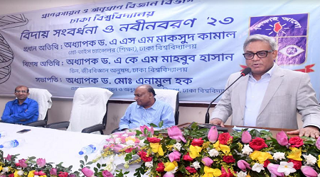 বিভাগীয় চেয়ারম্যান অধ্যাপক ড. মো. এনামুল হকের সভাপতিত্বে অনুষ্ঠানে জীববিজ্ঞান অনুষদের ডিন অধ্যাপক ড. এ কে এম মাহবুব হাসান বিশেষ অতিথি হিসেবে বক্তব্য রাখেন। প্রধান অতিথির বক্তব্যে অধ্যাপক ড. এ এস এম মাকসুদ কামাল নবীন শিক্ষার্থীদের অভিনন্দন ও বিদায়ী শিক্ষার্থীদের ভবিষ্যৎ জীবনের সফলতা কামনা করে বলেন, করোনা মহামারি, ডেঙ্গুসহ বিভিন্ন রোগ-ব্যাধির কারনে জীব-প্রযুক্তি শিক্ষা ও গবেষণার প্রয়োজনীয়তা ও গুরুত্ব দিন দিন বৃদ্ধি পাচ্ছে।