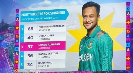 শনিবার তিন উইকেট শিকারের মধ্য দিয়ে নিউজিল্যান্ডের সাবেক তারকা ক্রিকেটার ড্যানিয়েল ভেট্টরিকে ছাড়িয়ে যান সাকিব। ভেট্টরি বিশ্বকাপে ৩২ ম্যাচে ৩৬ উইকেট শিকার করেছিলেন।