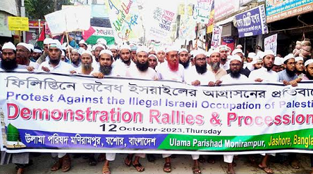 স্টাফ রিপোর্টার,মনিরামপুর(যশোর) : ফিলিস্তিনে ইসরাইলের হামলার প্রতিবাদে গতকাল বৃহস্পতিবার বিকিলে যশোরের মনিরামপুরে বিশাল বিক্ষোভ মিছিল ও সমাবেশ অনুষ্ঠিত হয়। মনিরামপুর উলামা পরিষদের উদ্যোগে বিকেল পাঁচটায় হাজারো মুসল্লিদের অংশগ্রহনে পৌরশহরে বিক্ষোভ মিছিল বের করা হয়। পরে পৌরশহরের কেন্দ্রীয় জামে মসজিদের সামনে বিক্ষোভ সমাবেশ অনুষ্ঠিত হয়। এতে সভাপতিত্ব করেন জামেয়া ইমদাদীয়া মদিনাতুল উলুম(মাদানিনগর) মাদ্রাসার মুহতামিম মুফতি আবদুর রশিদ।