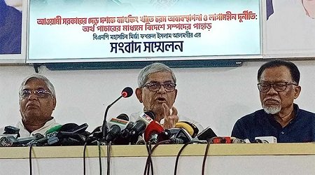 সরকারের সর্বগ্রাসী লুটপাট ও রাজনৈতিক দুর্বলতা দেশের অর্থনীতি ধ্বংসের জন্য দায়ী বলে মন্তব্য করেন মির্জা ফখরুল। তিনি বলেন, ব্যাংকঋণের নামে লুটপাট। রাজনৈতিক পরিচয় ব্যবহার করে দেশের টাকা লুট করে বিদেশে পাচার করেছে সরকার। দেশের অর্থনীতির দুরবস্থা একদিনে সৃষ্টি হয়নি। সরকারের উন্নয়নের স্লোগানের নিচে চাপা পড়েছিল।