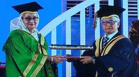 পরে ডিগ্রি গ্রহণের রেজিস্ট্রারে বঙ্গবন্ধুর পক্ষে স্বাক্ষর করেন প্রধানমন্ত্রী।