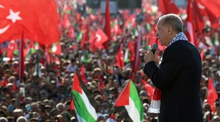 সমাবেশে লাখো জনতার সামনে দেওয়া ভাষণে তুর্কি প্রেসিডেন্ট গাজায় ইসরাইলি বর্বরতার কঠোর নিন্দা জানান। এ সময় হুঁশিয়ার করে তিনি বলেন, ‘ইসরাইলকে বিশ্বের কাছে যুদ্ধাপরাধী হিসেবে ঘোষণা করব। এর জন্য প্রস্তুতি নিচ্ছি আমরা।’বিশাল সমাবেশে এরদোগান দাবি করেন, হামাস কোনো সন্ত্রাসী সংগঠন নয়। হামাস গাজার প্রতিরোধ গোষ্ঠী।
