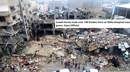 ইসমাইল থাওয়াবতা বলেন, ইসরায়েলি বাহিনী আল-শিফা হাসপাতালের ভেতর মরদেহ দাফন করতে নিষেধ করেছিল। সেজন্য হাসপাতালে অনেক মরদেহ জমে যায়। কয়েকদিন আগে কর্তৃপক্ষ হাসপাতাল প্রাঙ্গণে গণকবর খুঁড়ে সেগুলো দাফন করতে বাধ্য হয়। তবে আজ সকালে ইসরায়েলি বাহিনী বুলডোজার নিয়ে এসে গণকবর খুঁড়ে শতাধিক মরদেহ নিয়ে গেছে।