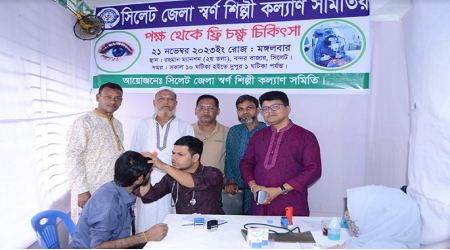 শহিদ আহমেদ খান সাবের,সিলেট প্রতিনিধি : সিলেট জেলা স্বর্ণ শিল্পী কল্যাণ সমিতির উদ্যোগে ফ্রি চক্ষু চিকিৎসা সেবা প্রদান করা হয়েছে। মঙ্গলবার (২১ নভেম্বর) সকাল ১০টা থেকে দুপুর ১টা পর্যন্ত সিলেট নগরীর বন্দরবাজারস্থ রহমান ম্যানশনের ২য় তলায় এ চিকিৎসা সেবা প্রদান করা হয়।