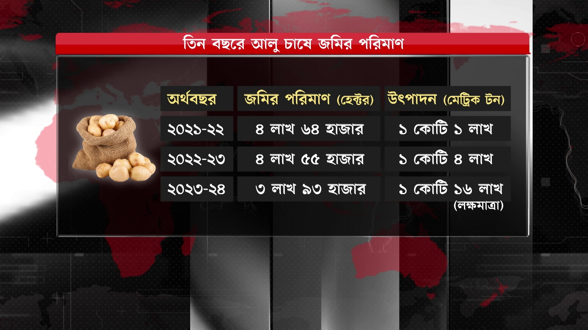 আবার উৎপাদন অংকে বাংলাদেশ পরিসংখ্যান ব্যুরো ও কৃষি সম্প্রসারণ অধিদফতর ও কোল্ড স্টোরেজ অ্যাসোসিয়েশনের তথ্যে রয়েছে ভিন্নতা। কৃষি সম্প্রসারণ অধিদফতর বলছে, ২০২৩ সালে ১ কোটি ৪ লাখ মেট্রিক টন আলু উৎপাদন হয়েছে। অপরদিকে বাংলাদেশ পরিসংখ্যান ব্যুরোর হিসাব বলছে, গত বছর উৎপাদন হয়েছে ১ কোটি মেট্রিক টনেরও কম আলু। আবার বিদায়ী বছরে ৮৫ লাখ মেট্রিক টন আলু উৎপাদনের কথা বলছে কোল্ড স্টোরেজ অ্যাসোসিয়েশন।