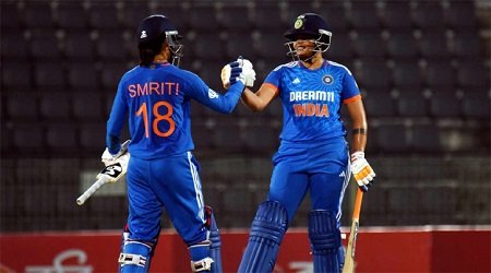 রান তাড়ায় নেমে পাওয়ার প্লে শেষ হতেই ভাগ্য অনেকটাই নির্ধারিত হয়ে যায়। বাংলাদেশের মতো ভারতও উইকেট হারায়নি প্রথম ছয় ওভারে। কিন্তু তারা করে ৫৯ রান। ২৬ বলে তখন ৪৩ রান করে ফেলেছেন শেফালি ভার্মা। এরপর রানের গতি কিছুটা কমে যায়। ৩৭ বলে হাফ সেঞ্চুরি পূর্ণ করেন শেফালি।